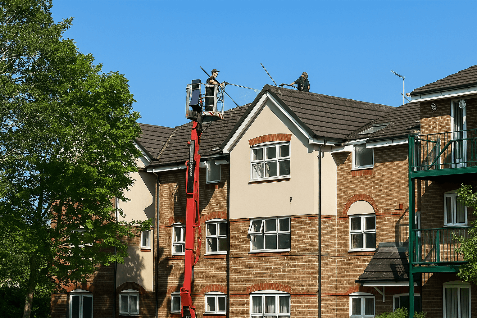 We used MEWPs and mobile access towers to safely reach and clean multiple roofs. Moss was cleared, gutters unblocked, and biocide treatments applied to preserve the tiles.